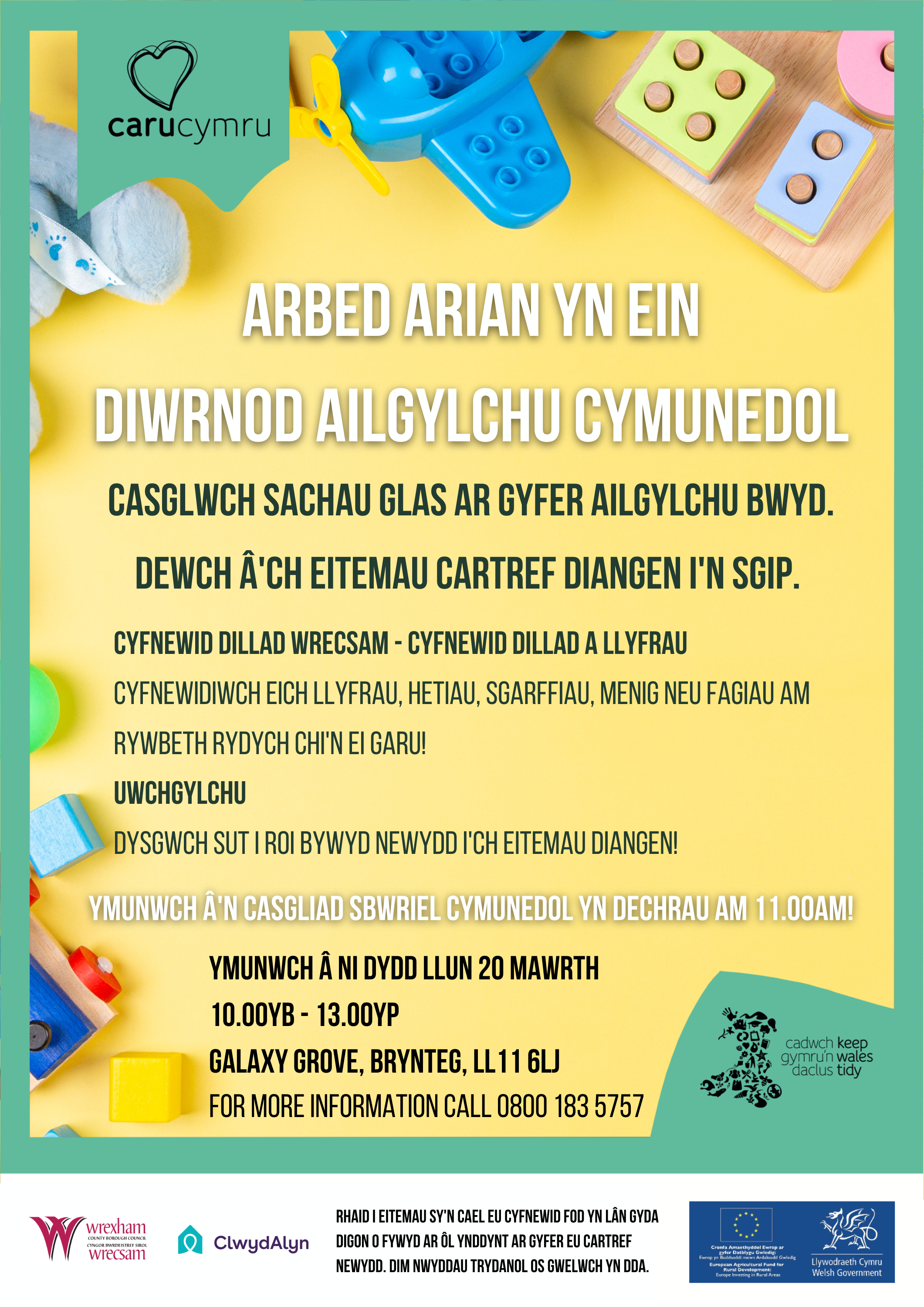 Mae Caru Cymru yn cynnal diwrnod ailgylchu cymunedol ym Mrynteg, ddydd Llun, Mawrth 20, ac fe anogir preswylwyr i ddod draw i ailgylchu’r eitemau nad oes eu hangen arnynt.